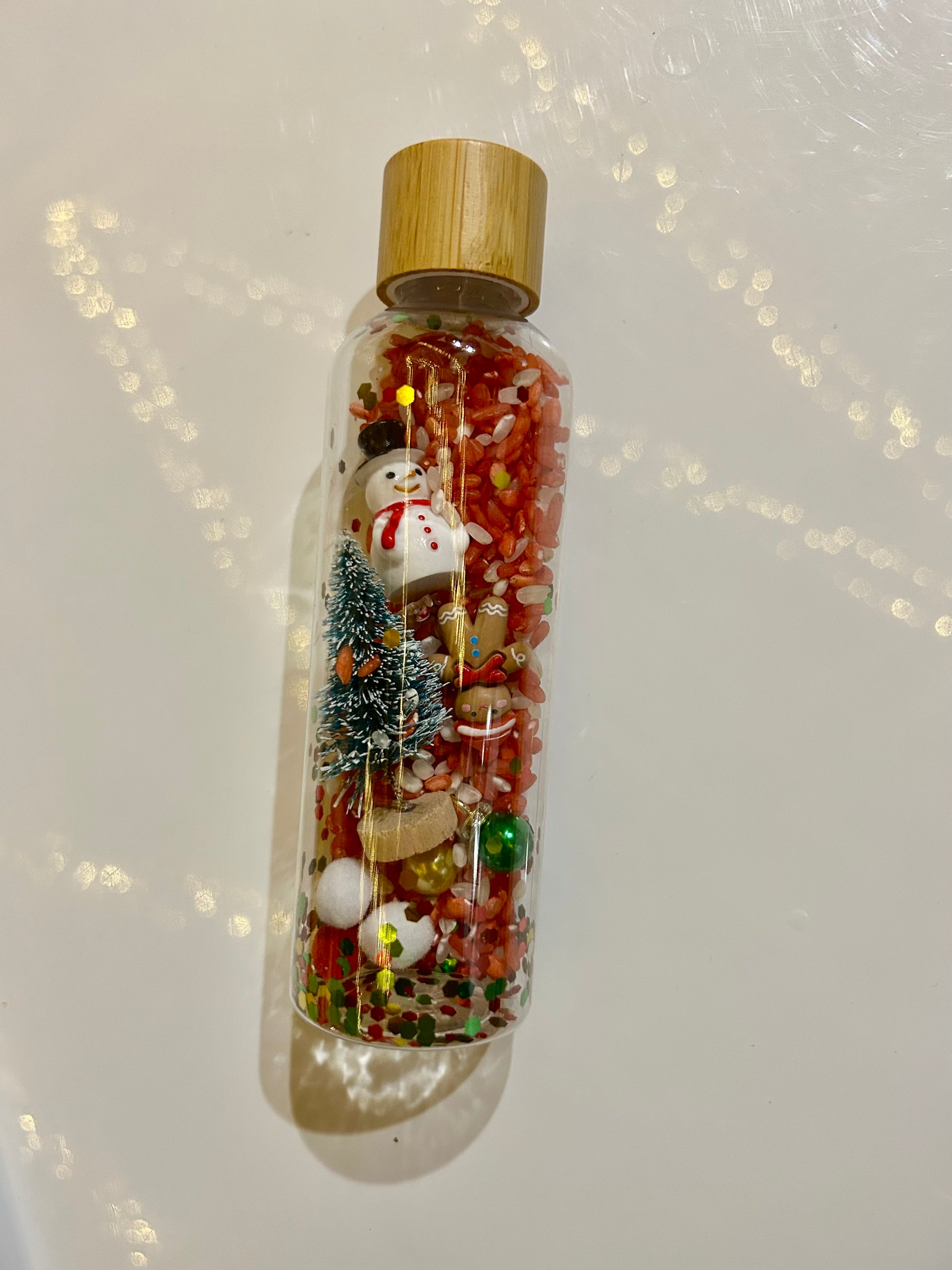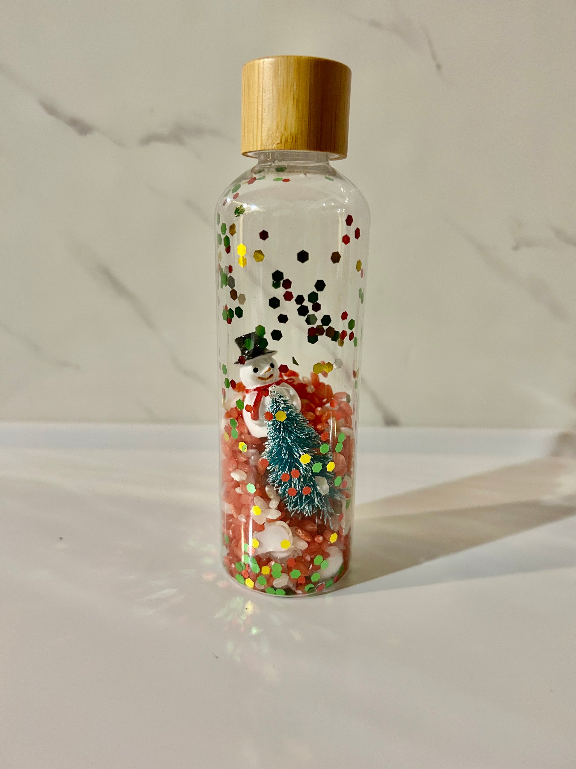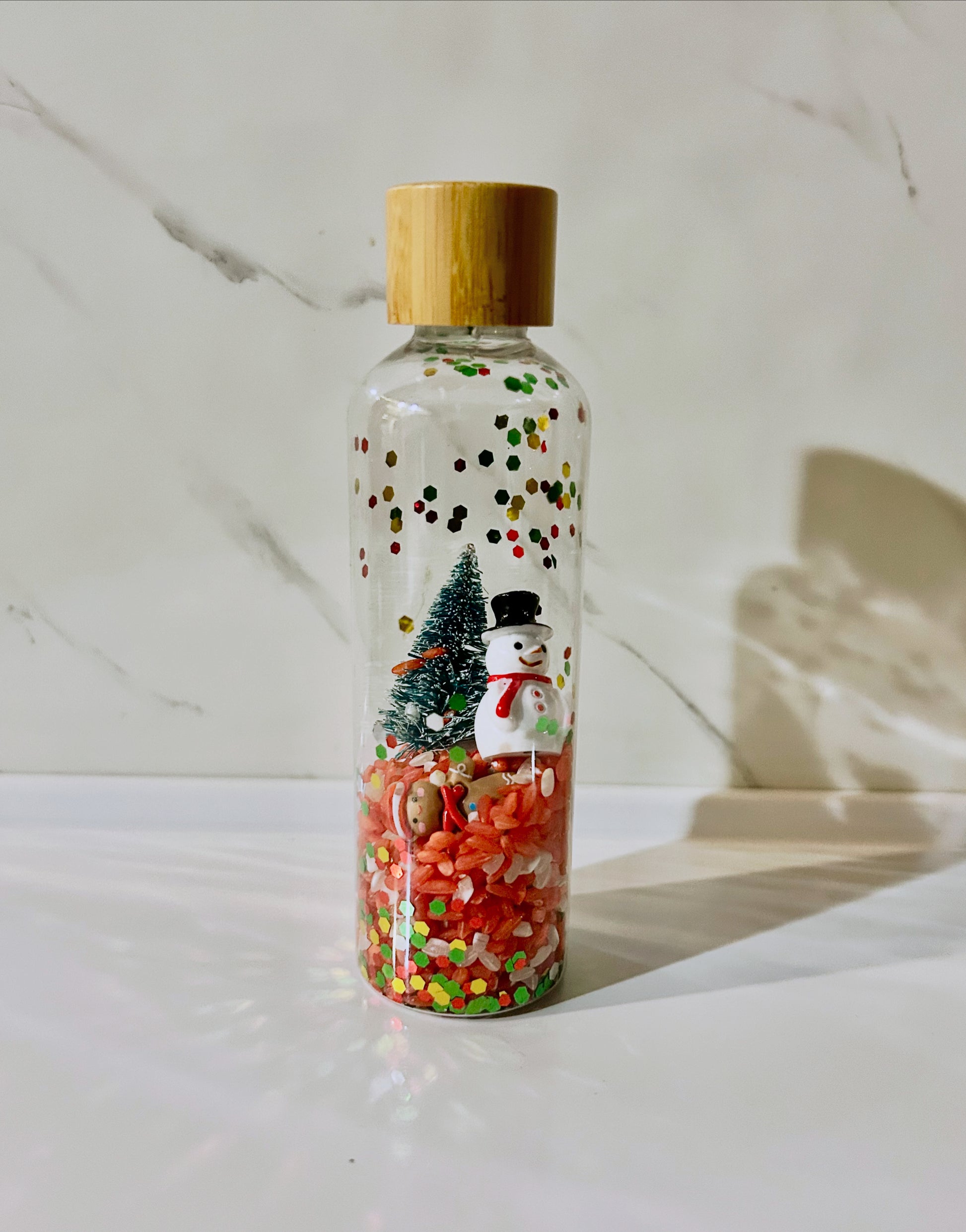 Cette création évoque la douceur d’un Noël traditionnel : un adorable bonhomme de neige, un petit sapin enneigé et des grains de riz colorés qui se déplacent doucement lorsqu’on manipule la bouteille.