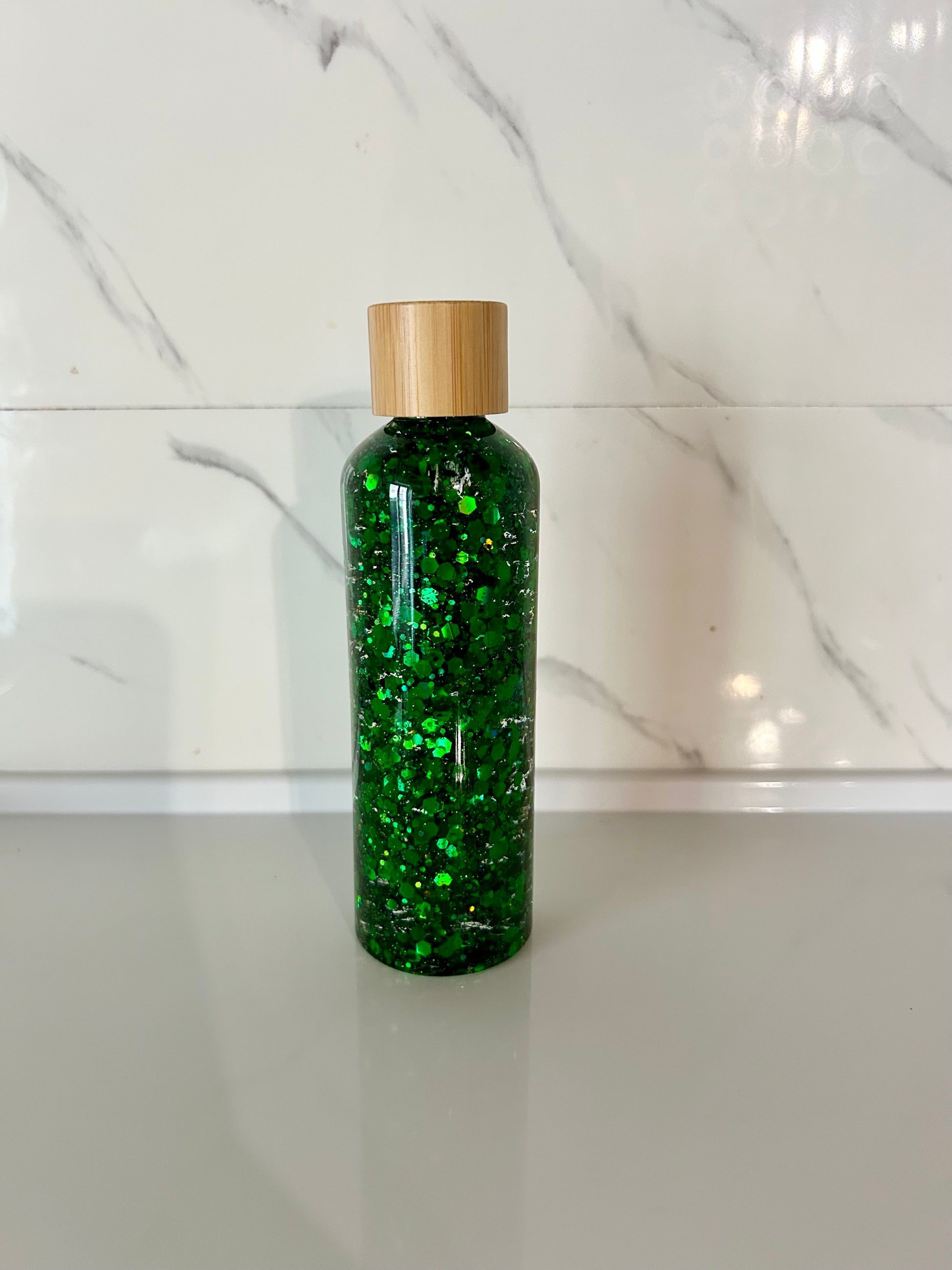 Cette bouteille sensorielle révèle toute la beauté du vert profond et des paillettes chatoyantes, rappelant la pureté et la puissance des pierres précieuses.