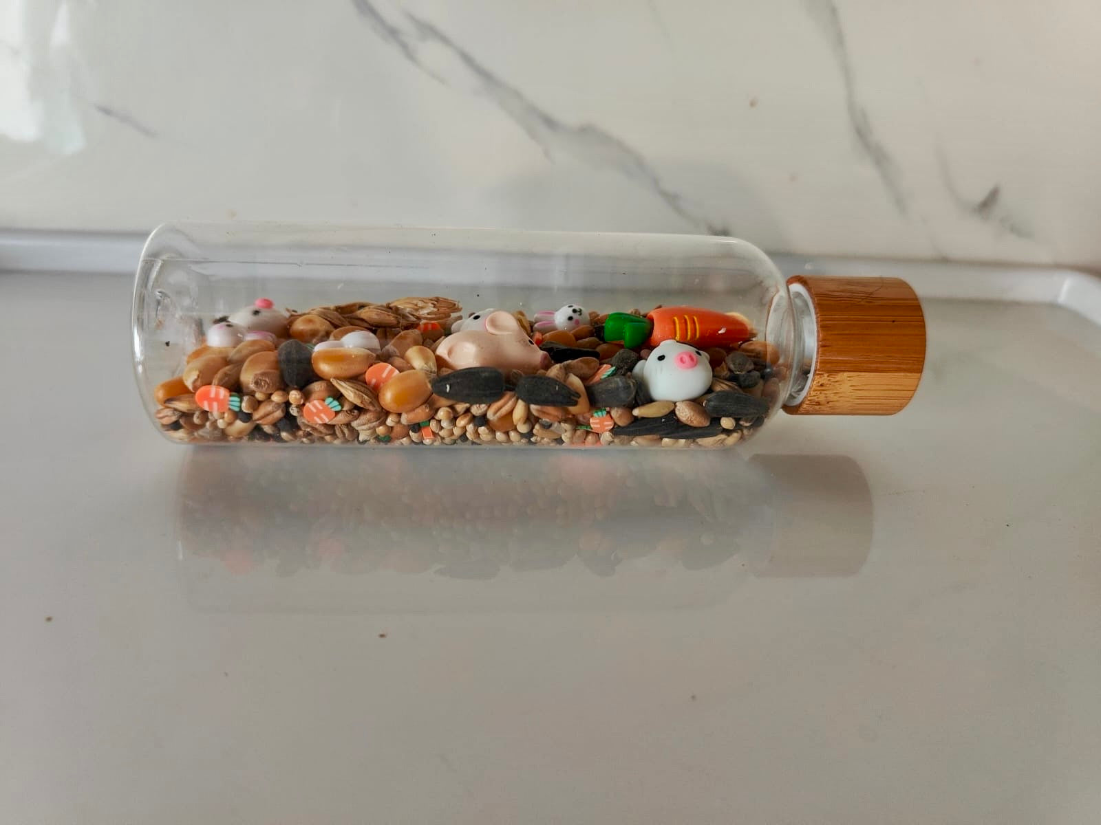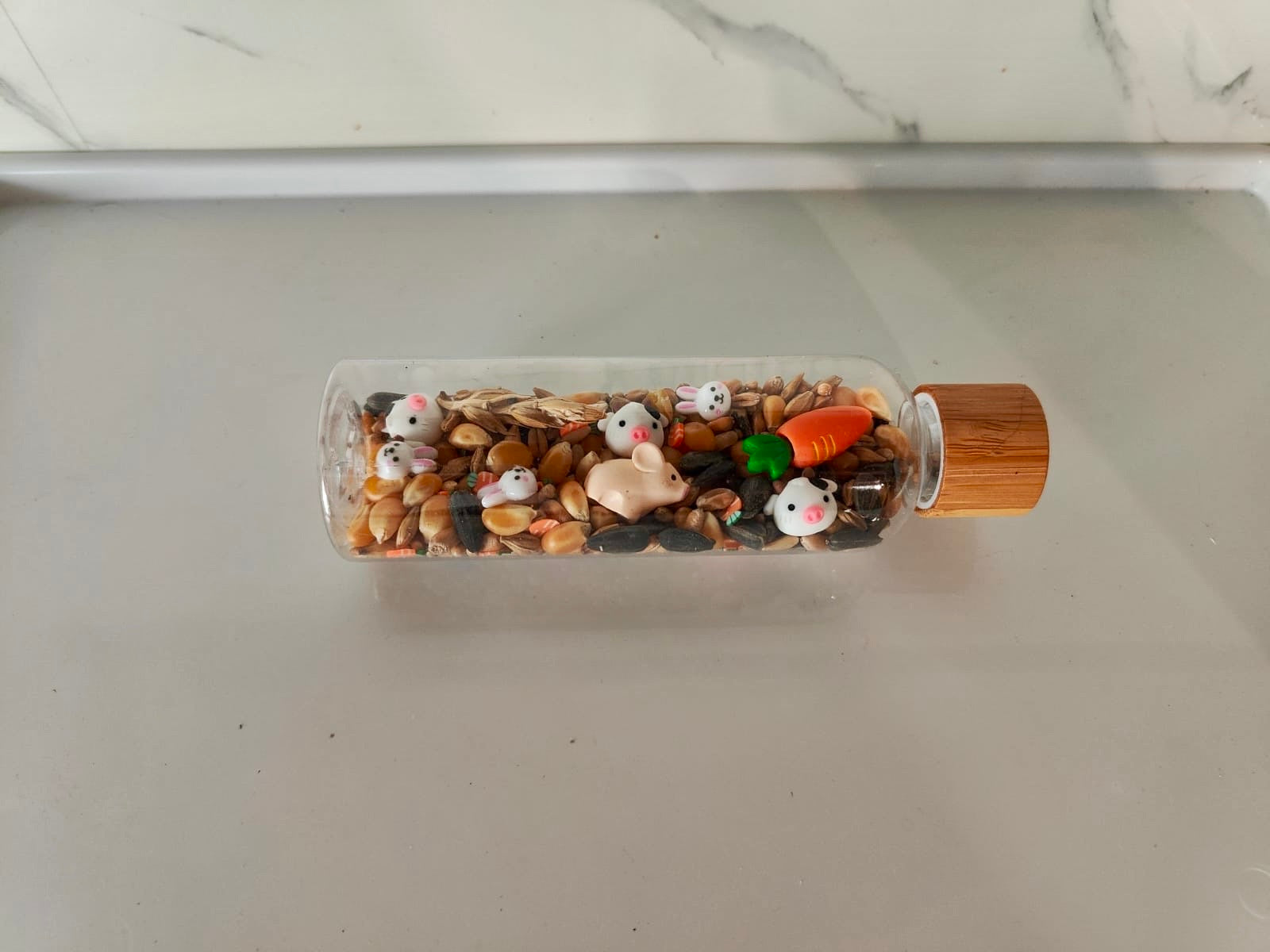 - Contient des graines d’oiseaux, du maïs et des éléments miniatures (animaux, carottes)