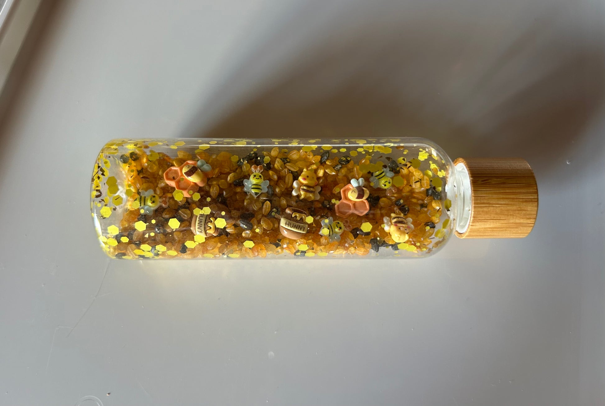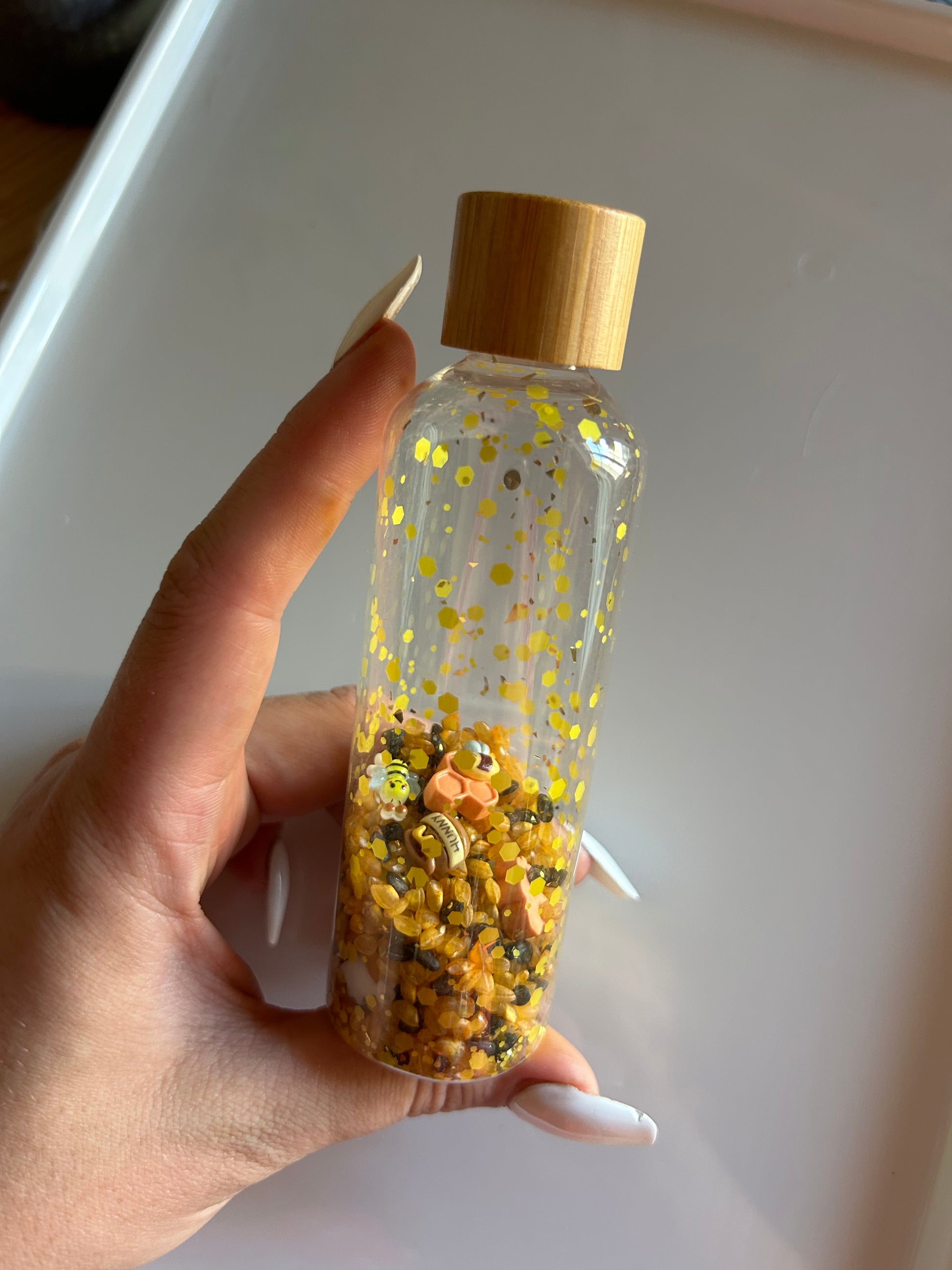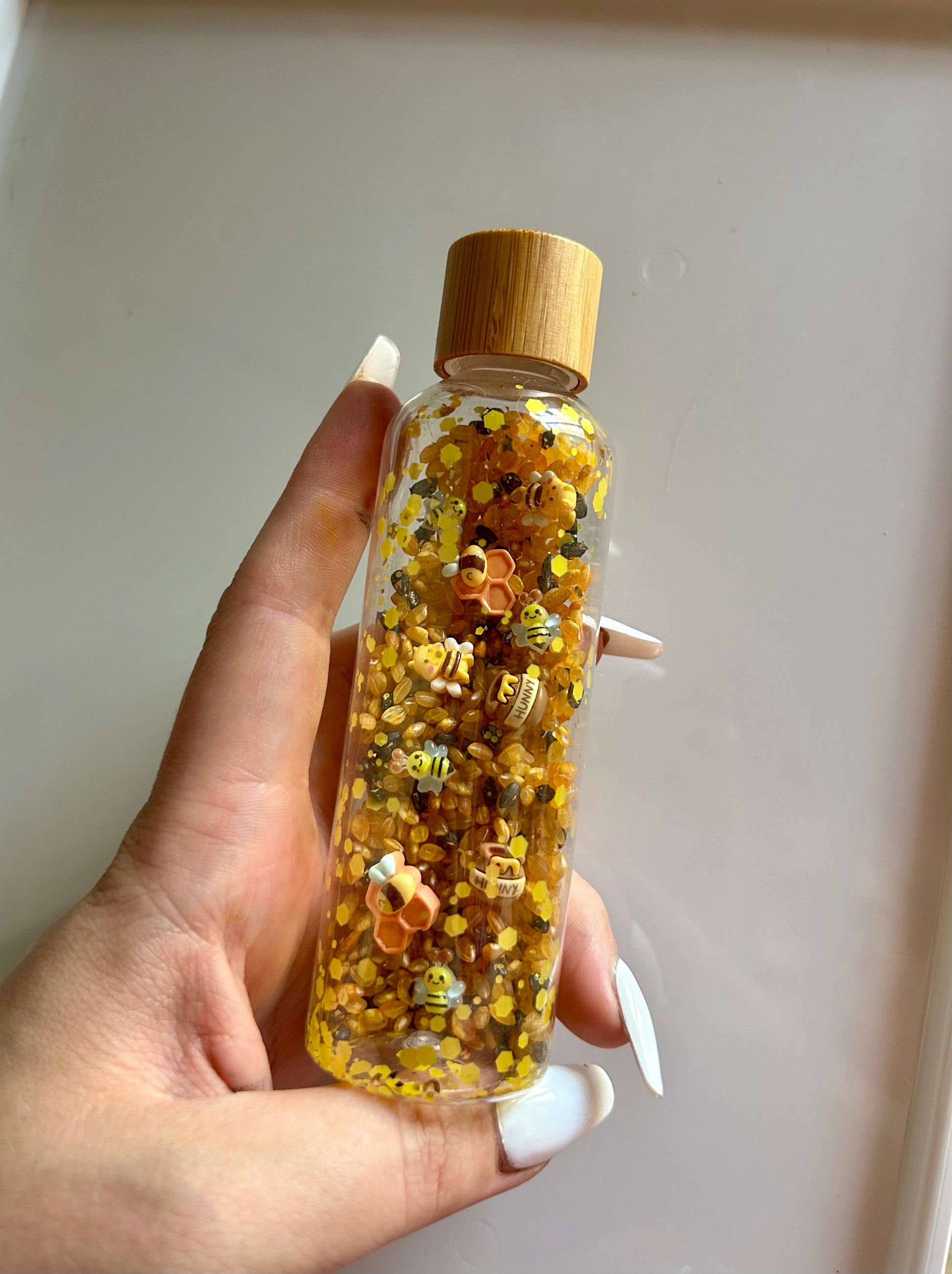 Le mélange de riz jaune et noir crée un doux son lorsqu’on agite la bouteille, tandis que les paillettes dorées rappellent les alvéoles scintillantes d’une ruche.