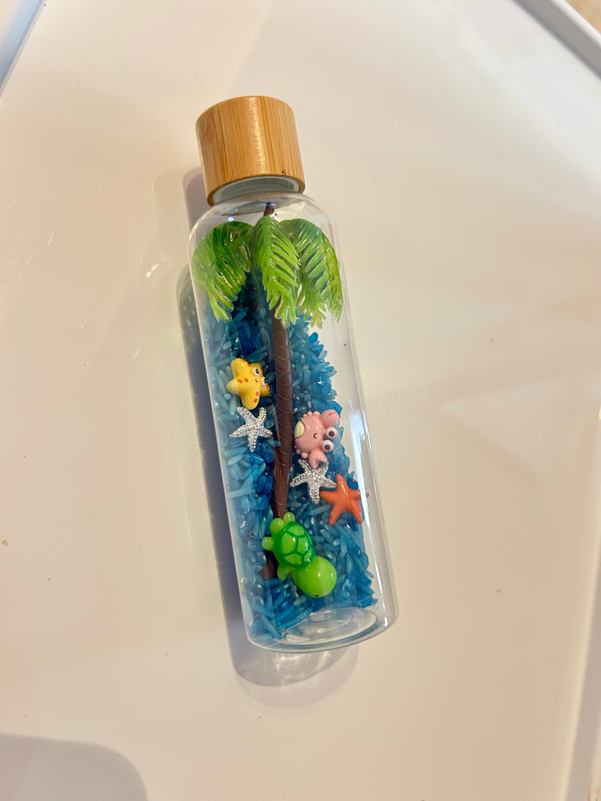 Le riz bleu ondule doucement lorsqu’on manipule la bouteille, tandis que les petits éléments — palmier, tortue, étoiles de mer et coquillages — rappellent la beauté et la sérénité des fonds marins.