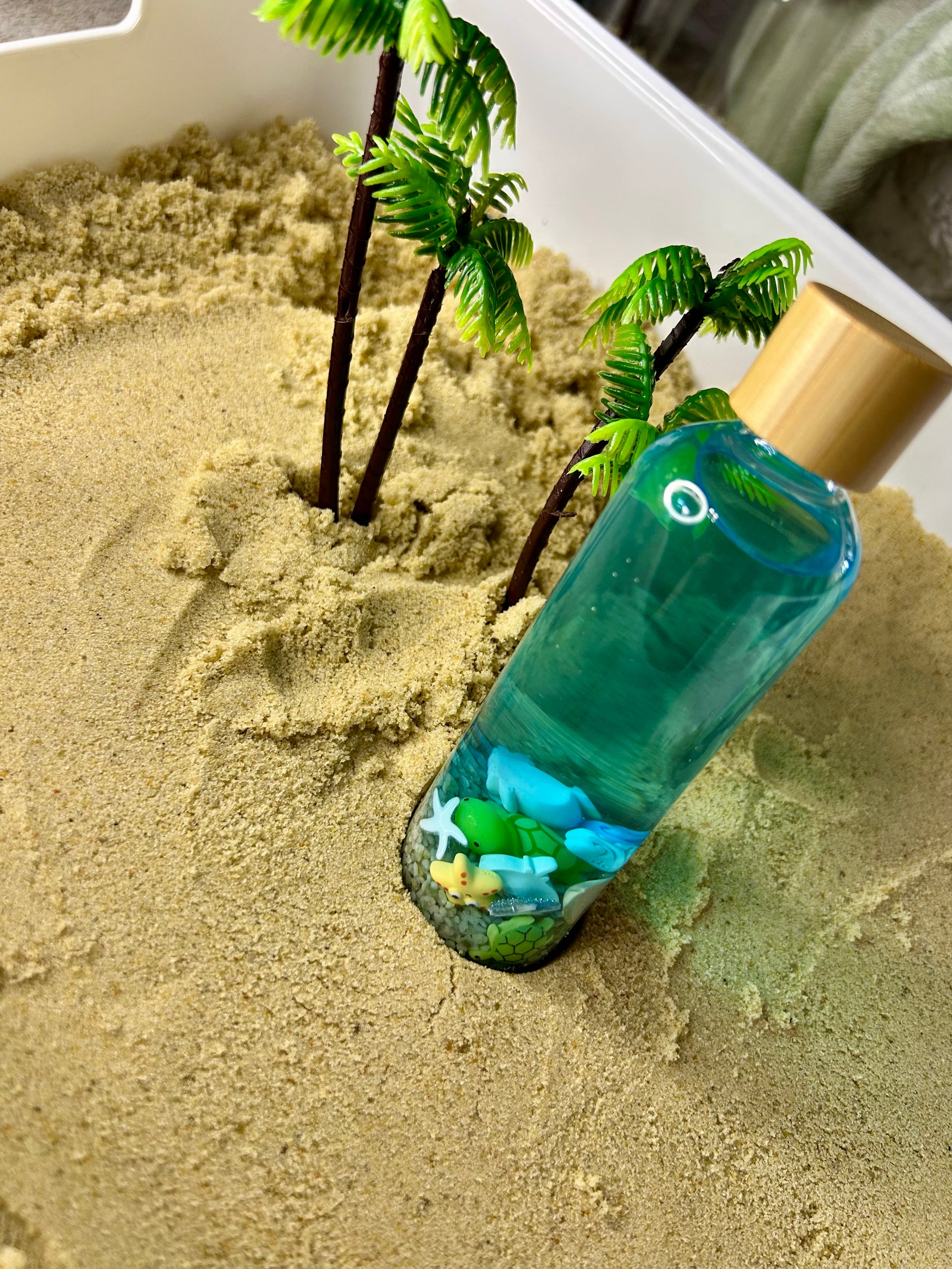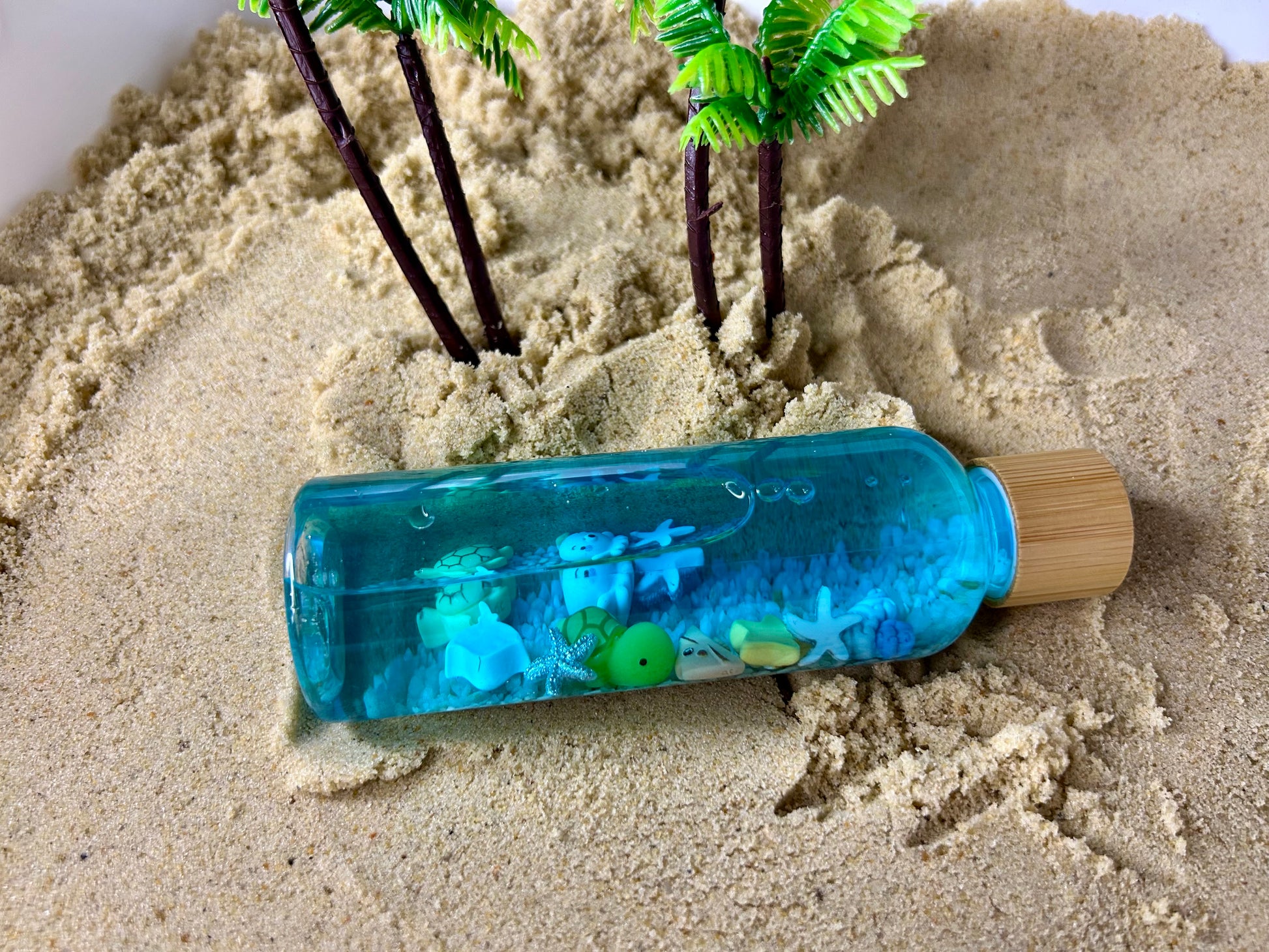 Entre sable, vagues et petits trésors de la mer, cette bouteille sensorielle invite à l’évasion et à la découverte 🌊🐢🌟