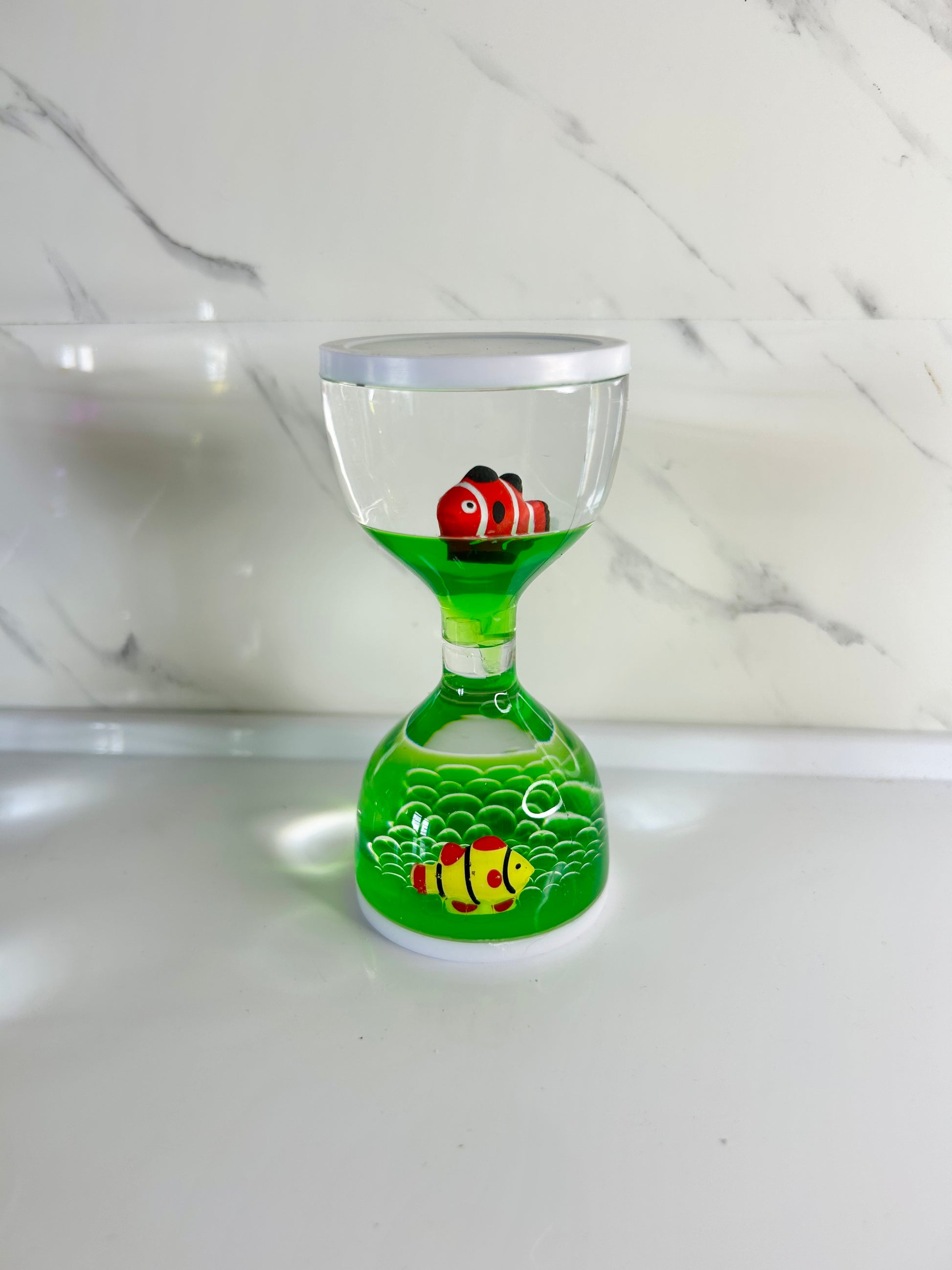- Poissons miniatures présents dans la partie haute et basse du sablier