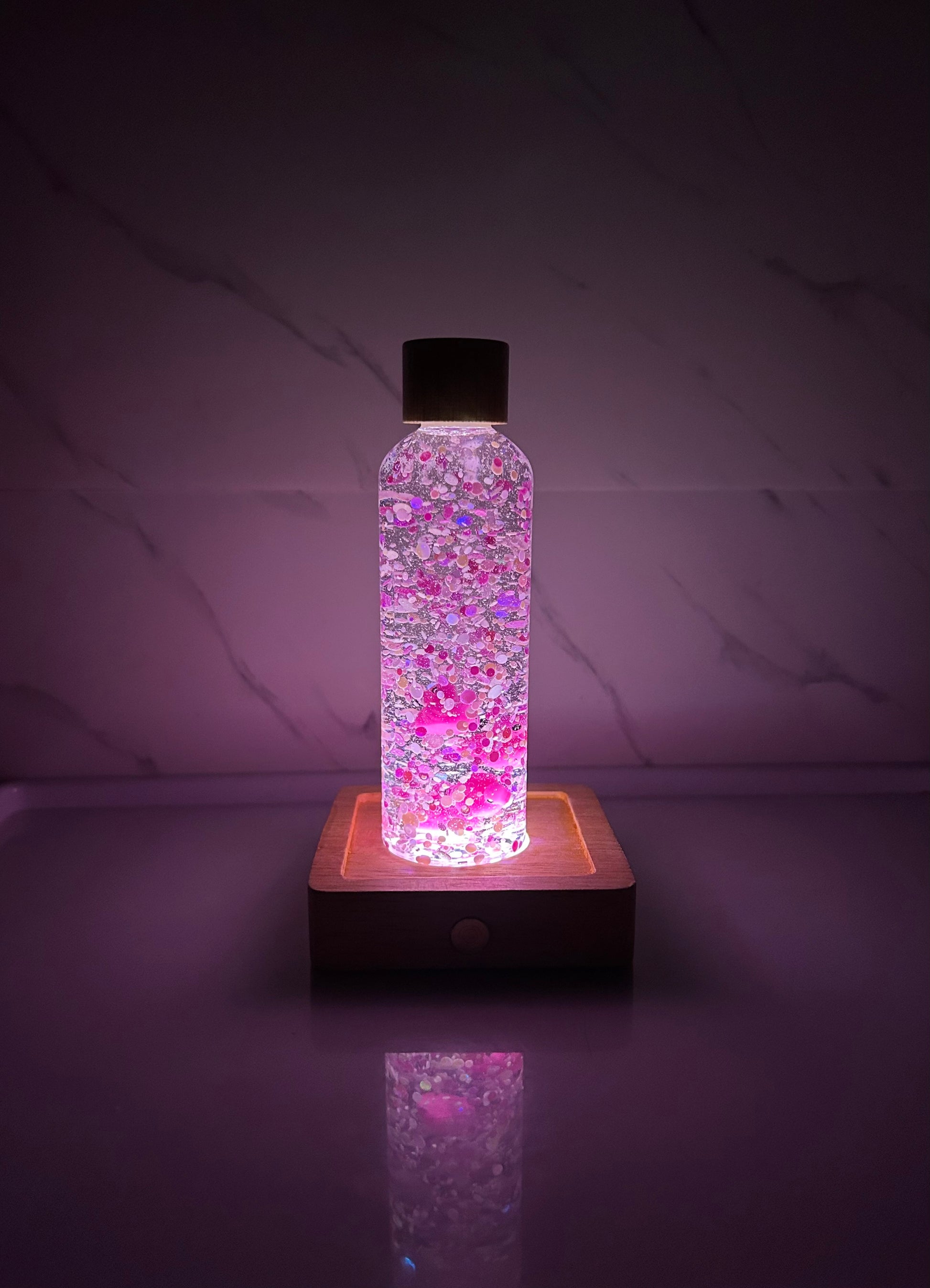 Idéal pour sublimer vos créations sensorielles, ce support diffuse une douce lumière qui met en valeur les paillettes, les couleurs et les mouvements à l’intérieur de la bouteille.