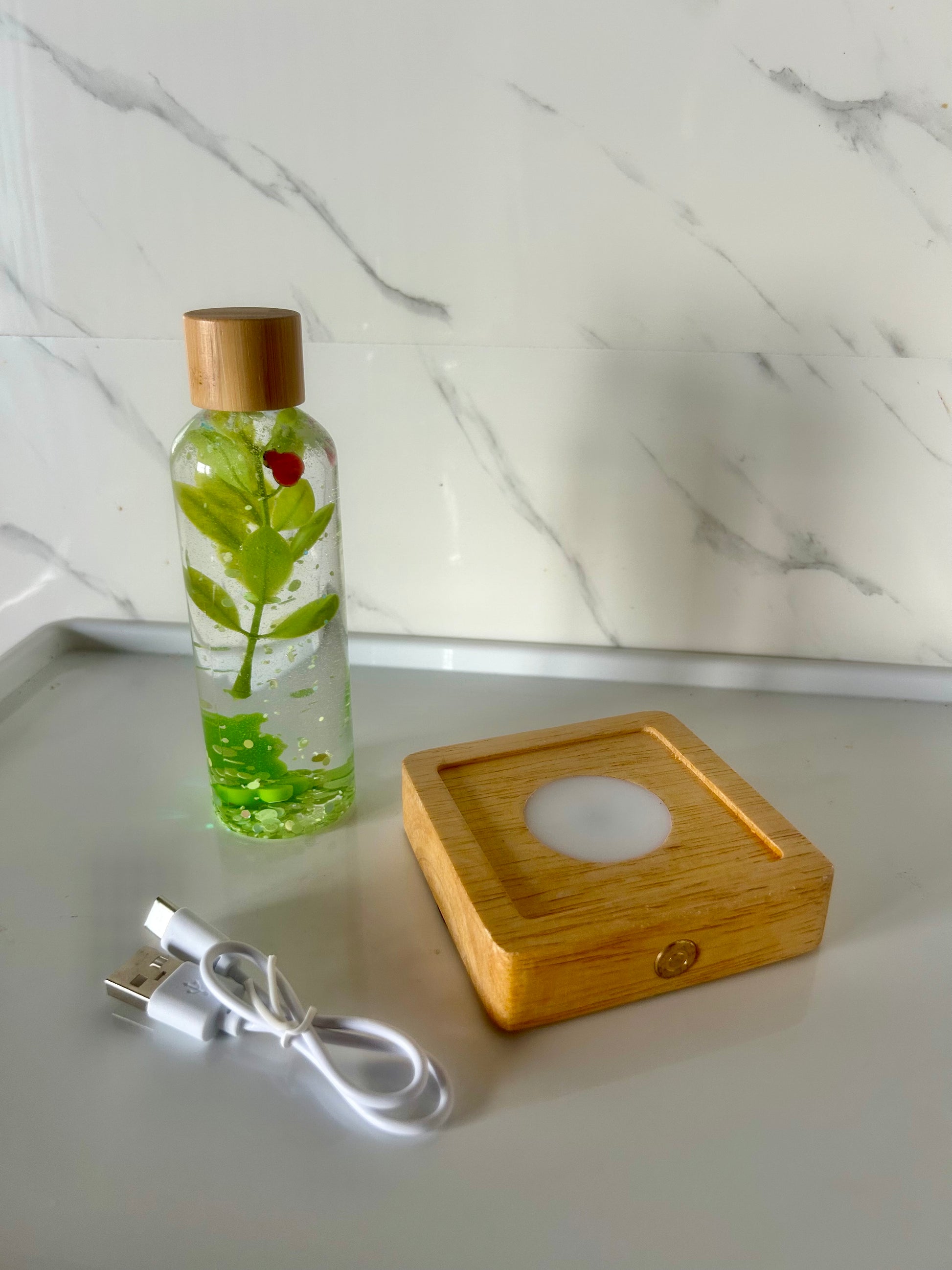 Transformez vos bouteilles sensorielles en véritables veilleuses féériques grâce à ce socle lumineux en bois massif !